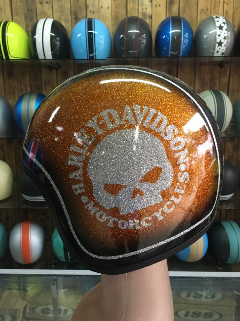100% handmade of airbrush painted of Skull with Harley Davidson style on the motorcycle helmet and have a look glowing if exposed on the sun. Its suitable for Harley Davidson rider.