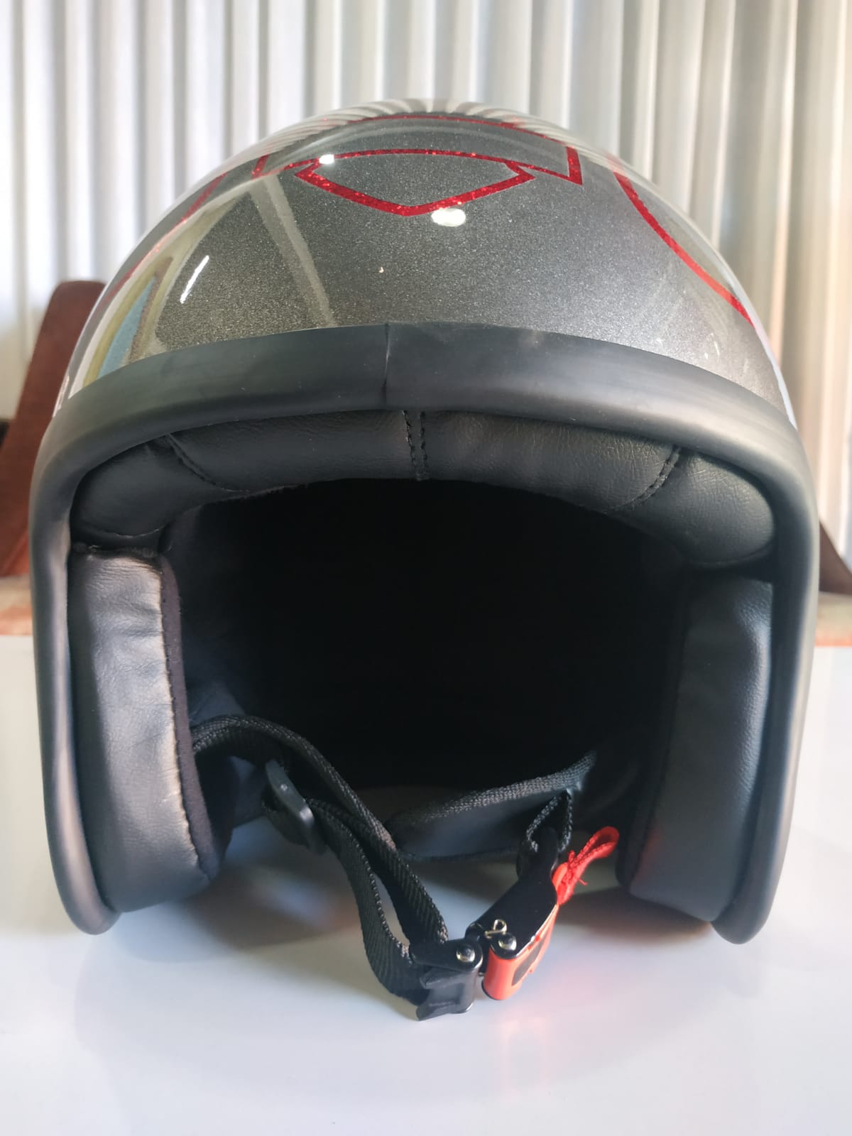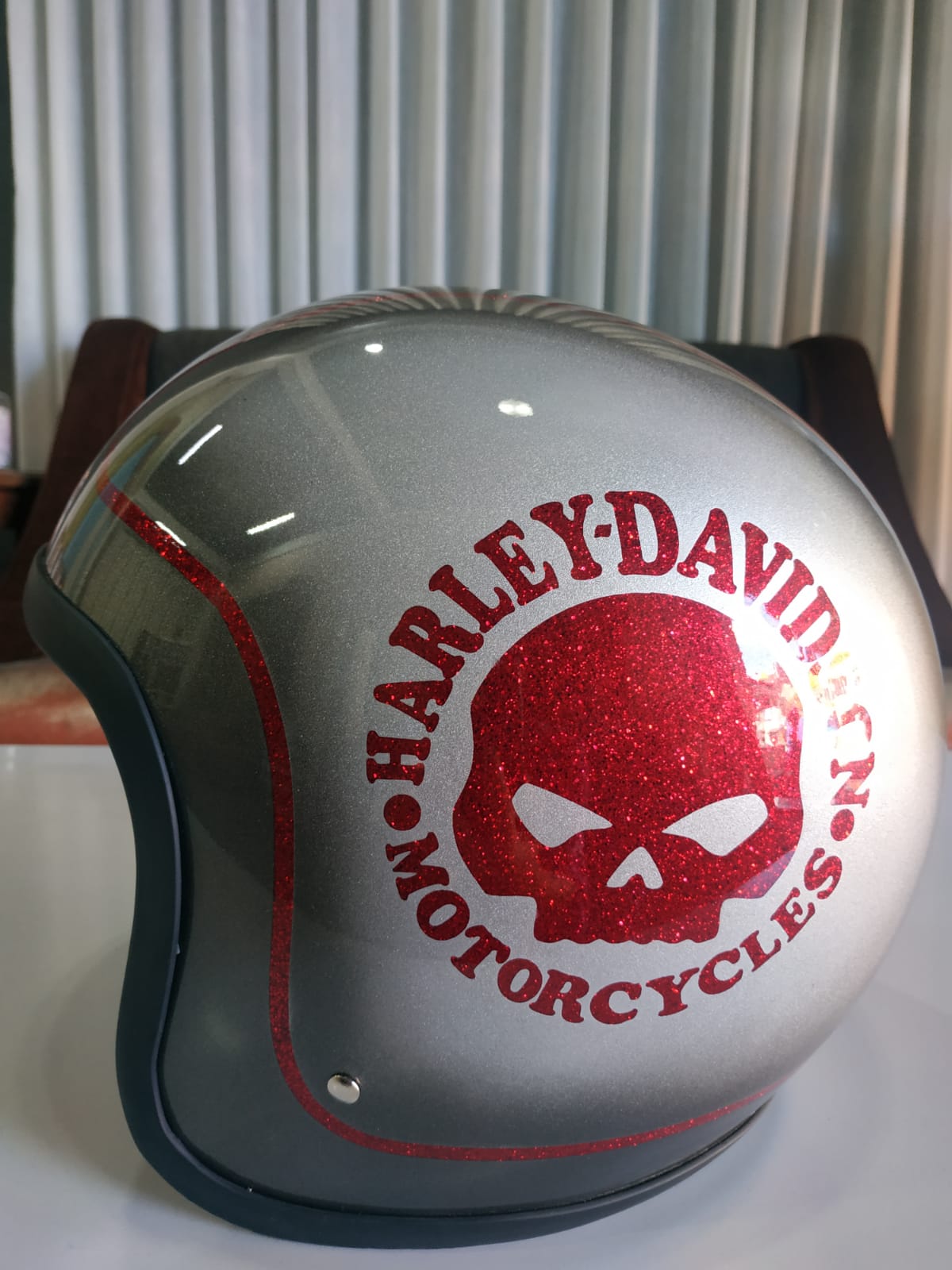 Glossy Silver Harley Davidson Open Face Motorcycle Helmet with Red Glitter Logo Skull